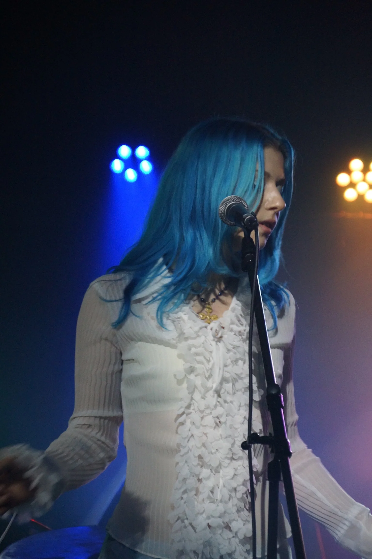 A woman with vibrant blue hair singing into a microphone on stage with colorful background lights.