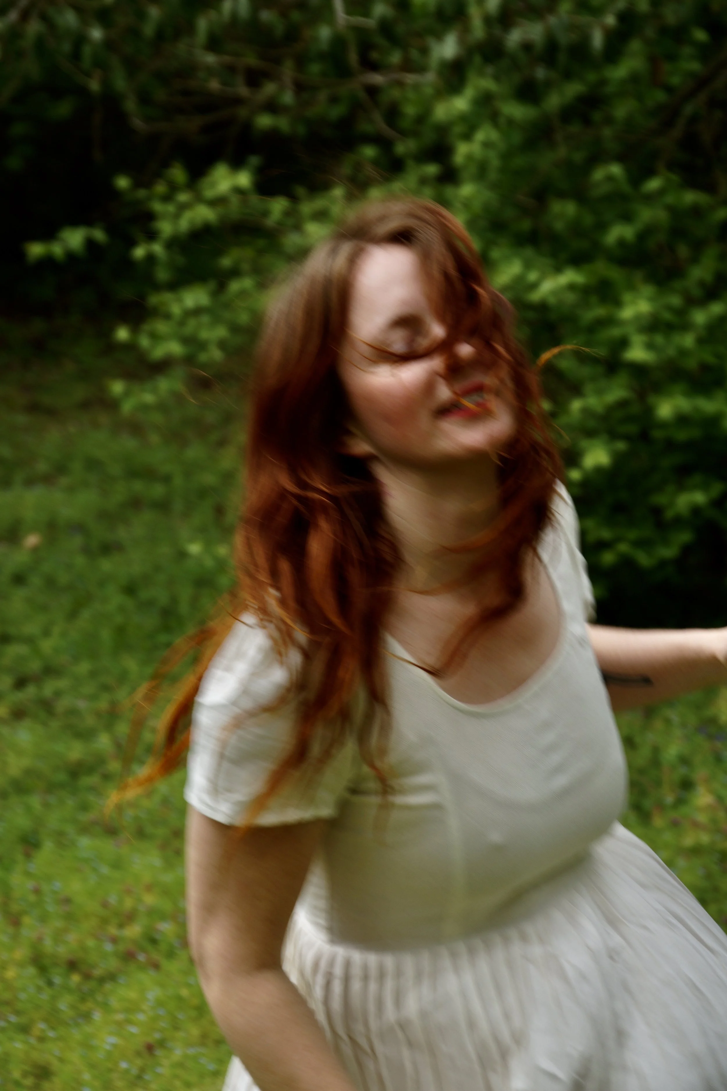 A woman with red hair smiling and laughing outdoors, surrounded by green foliage.