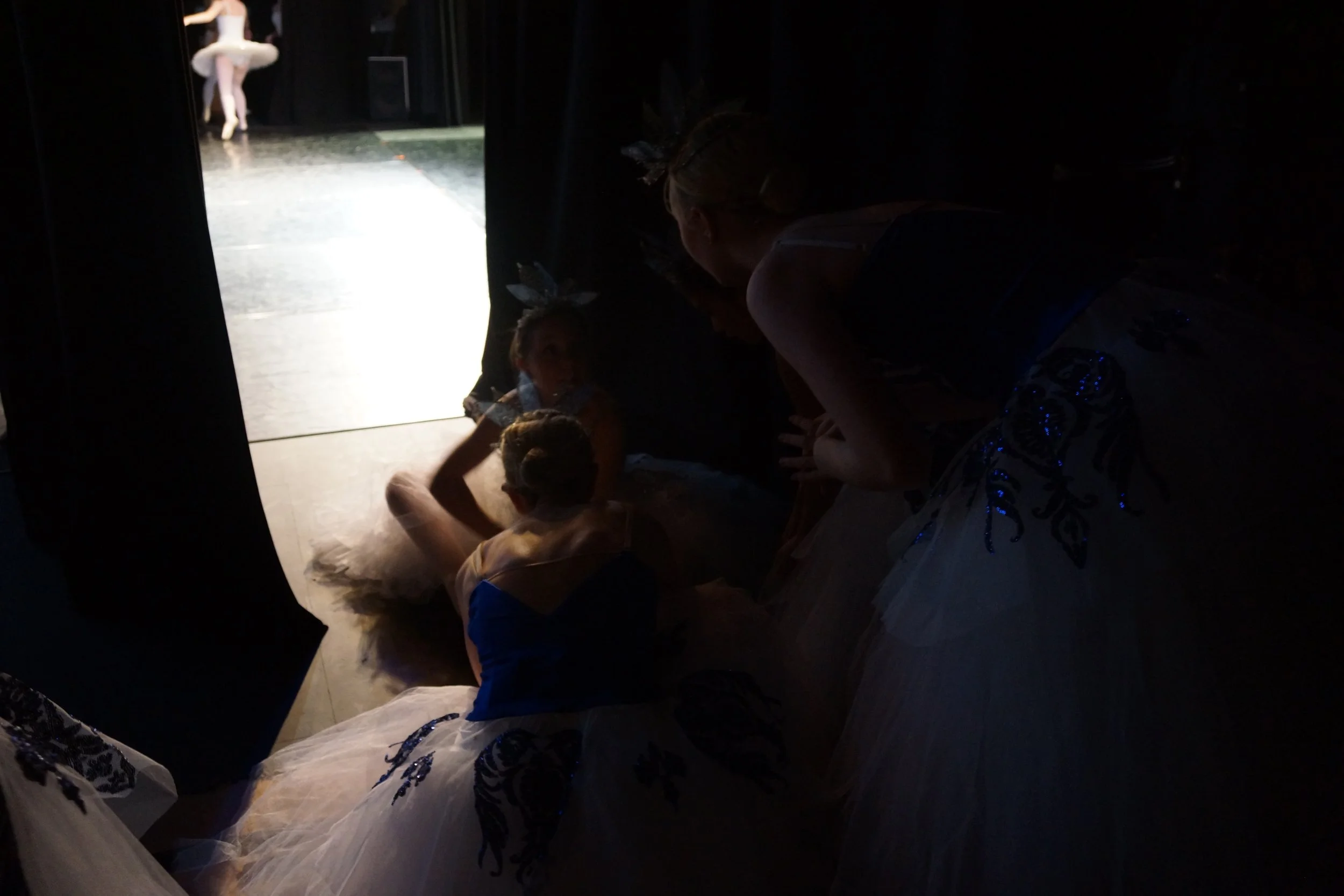 Backstage view of young ballet dancers in tutus with bunny ears, preparing before a performance.