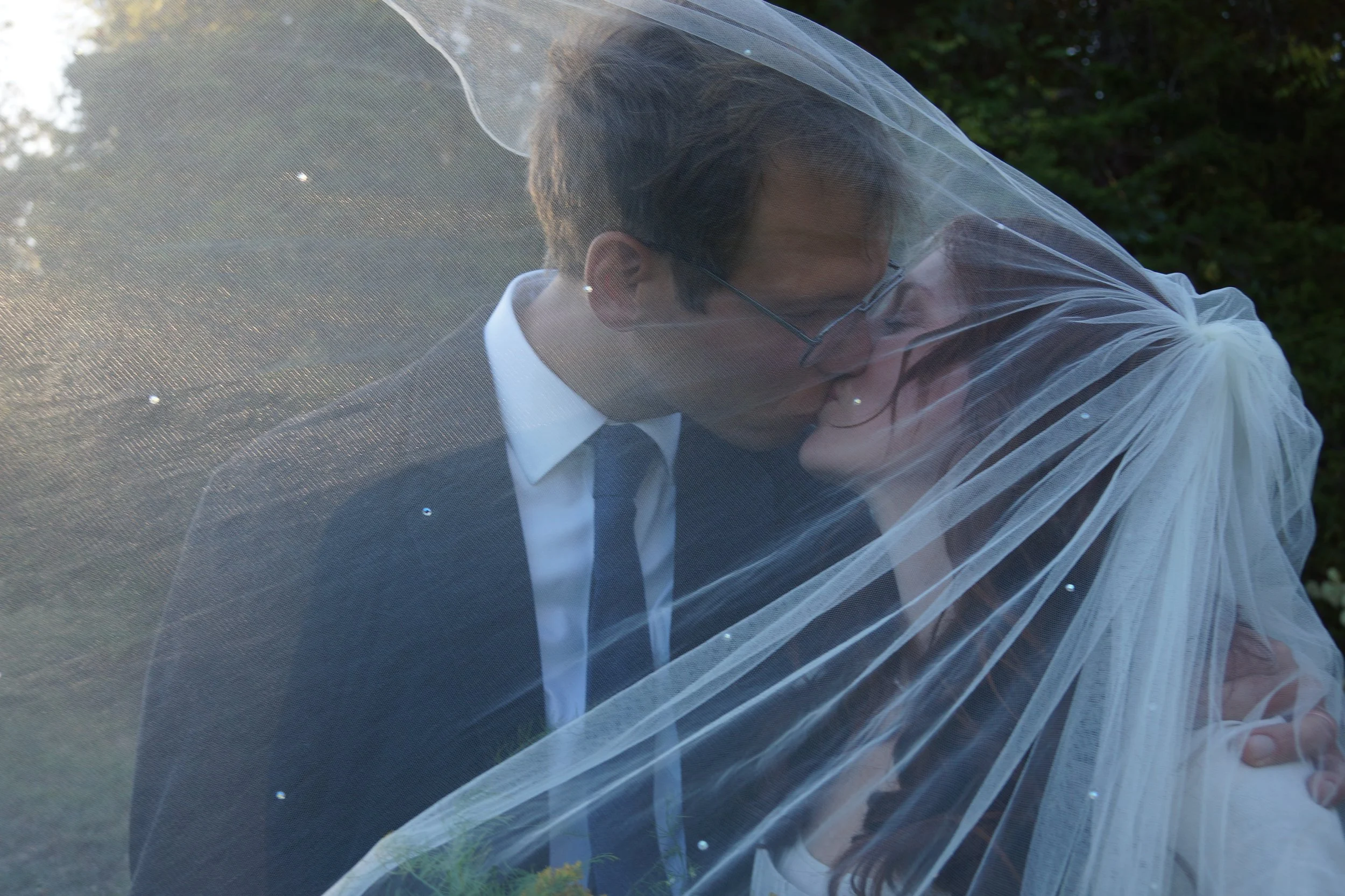 A couple dressed in wedding attire sharing a kiss outdoors, partially covered by a sheer veil.
